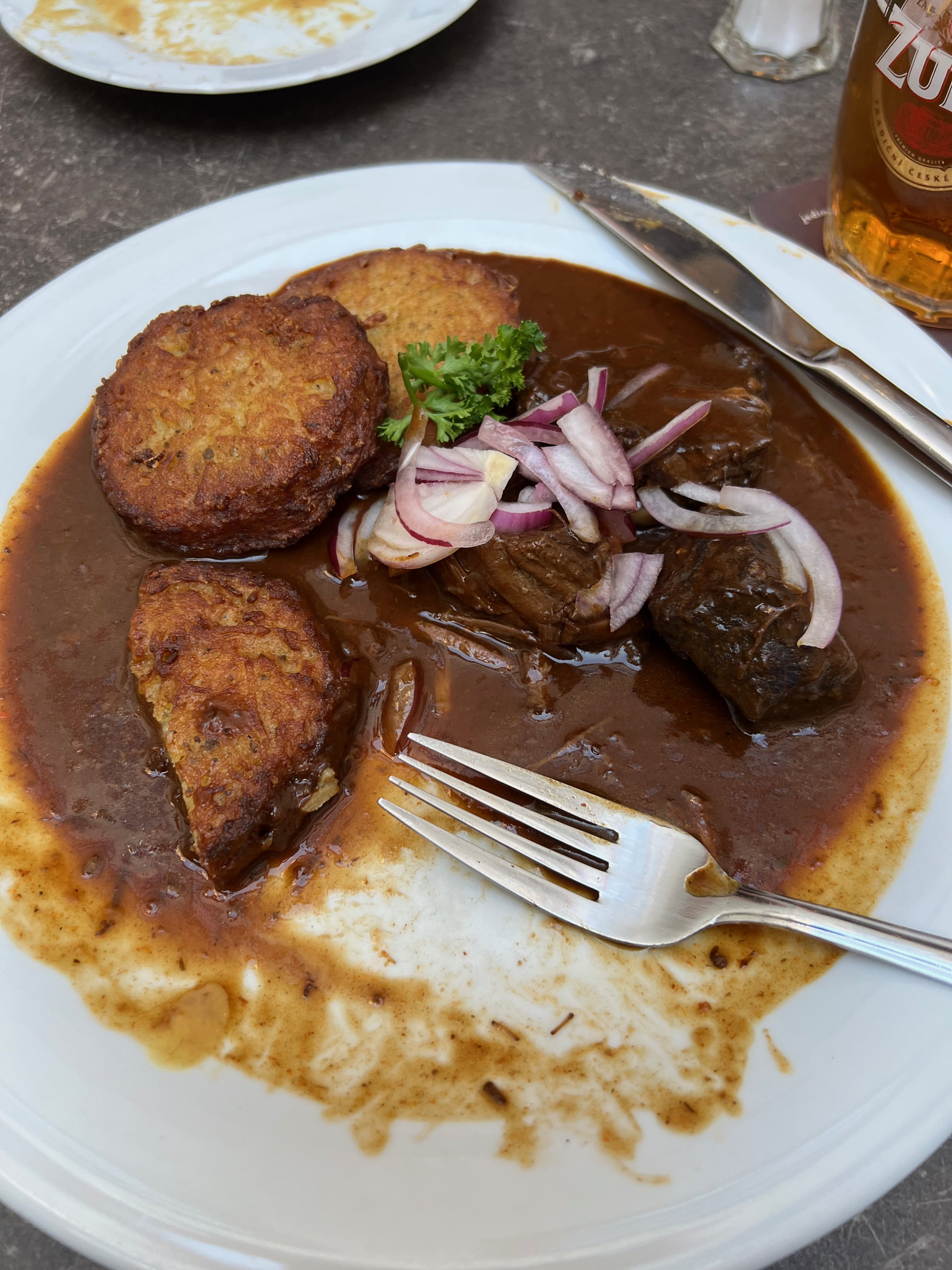 - Svíčková na smetaně - pureed veggie cream sauce served w/beef & bread dumplings (knedlíky)